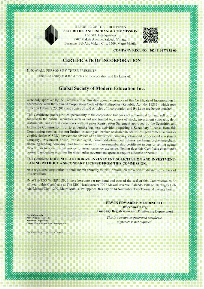 The Global Society of Modern Education (GSOME) is proud to announce a significant milestone in its journey to transform education: the organization is now officially registered with the Philippine Securities and Exchange Commission (SEC) as a duly compliant corporation. This achievement marks a new chapter in our mission to revolutionize education and empower learners and educators worldwide.